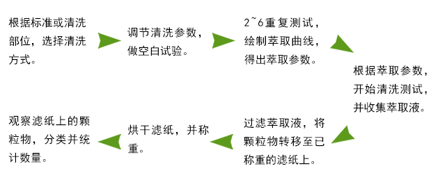 使用某種或多種機械方法,通過清洗液在規定的時間內,把污染物從樣品上分離到清洗液中,最終把萃取液過濾到測試濾膜上,分析濾膜上的顆粒重量、數量、性質等。